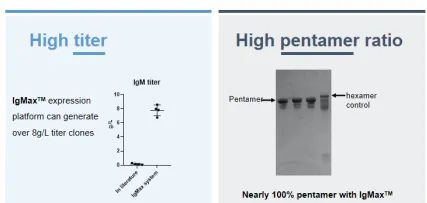 IgM類抗體一般呈五聚體結(jié)構(gòu),分子量大,糖基化位點多,結(jié)構(gòu)復(fù)雜,單克隆細胞株構(gòu)建和工藝開發(fā)難度大。漢騰生物團隊在前期的細胞株構(gòu)建階段,結(jié)合IgM平臺專有載體系統(tǒng)篩選優(yōu)化獲得了高產(chǎn)細胞株,產(chǎn)生的五聚體比例可高達100%,幾乎無六聚體產(chǎn)生,減少工藝開發(fā)難度。