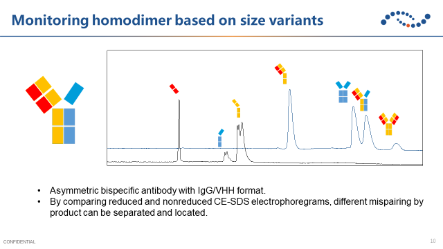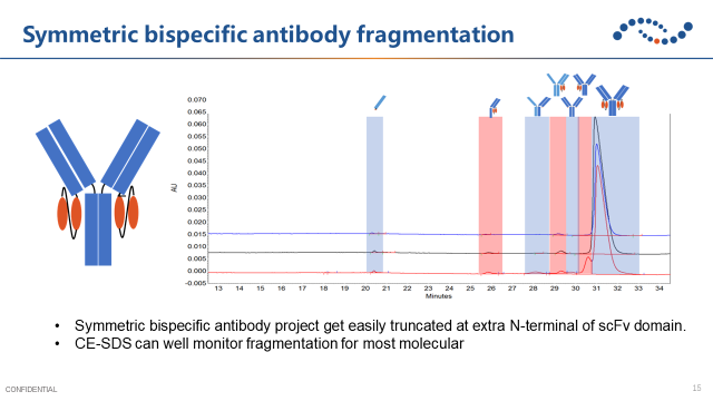 對稱性抗體通過鏈接亞基來實(shí)現(xiàn)雙特異性,但容易出現(xiàn)共價結(jié)合的聚集體或者在亞基上發(fā)生的斷裂。因此需要在工藝研發(fā)過程中重點(diǎn)關(guān)注聚集體和碎片,例如使用毛細(xì)管凝膠電泳監(jiān)控碎片。