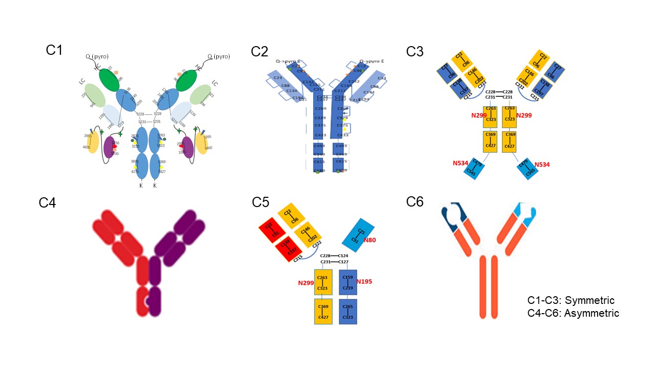 首先通過In-silico分析等方法對雙抗進行氨基酸序列分析,提前預(yù)測質(zhì)量及結(jié)構(gòu)上的風(fēng)險點以及關(guān)鍵質(zhì)量參數(shù)等,從分子角度對其穩(wěn)定性及功能進行優(yōu)化設(shè)計,為后續(xù)的工藝開發(fā)(包括表達體系、細胞培養(yǎng)、純化和制劑工藝)提供理論支持。