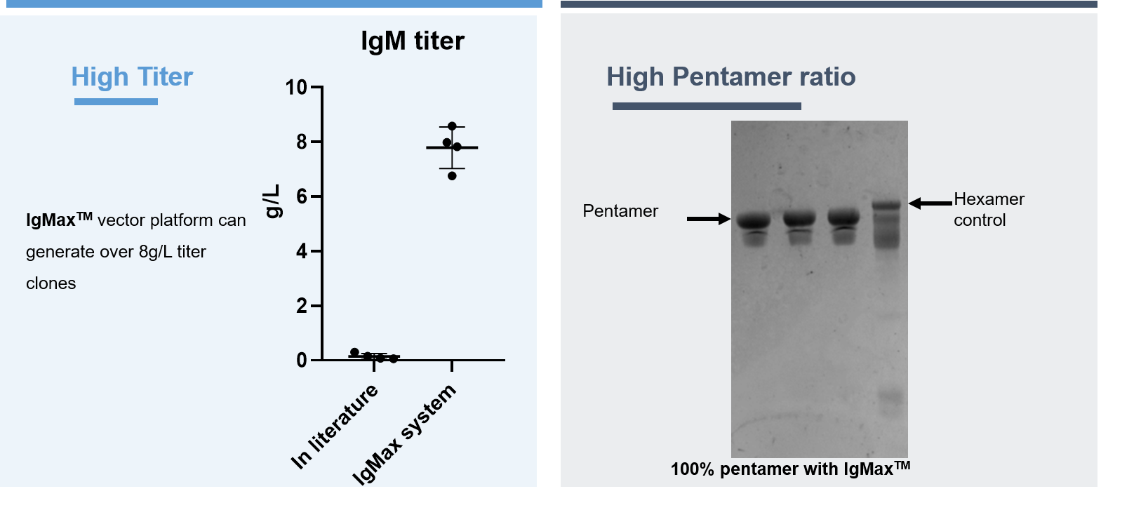 關(guān)于lgM的開發(fā),已有文獻記載其產(chǎn)量非常低。漢騰生物在高表達IgM方面具有豐富經(jīng)驗,IgMax®平臺是漢騰生物自主研發(fā)的平臺,通過特殊設(shè)計的載體系統(tǒng),細胞株產(chǎn)量可達8g/L,并且IgM構(gòu)型均一,五聚體比例100%,無六聚體產(chǎn)生,從源頭避免后續(xù)六聚體難去除風(fēng)險。