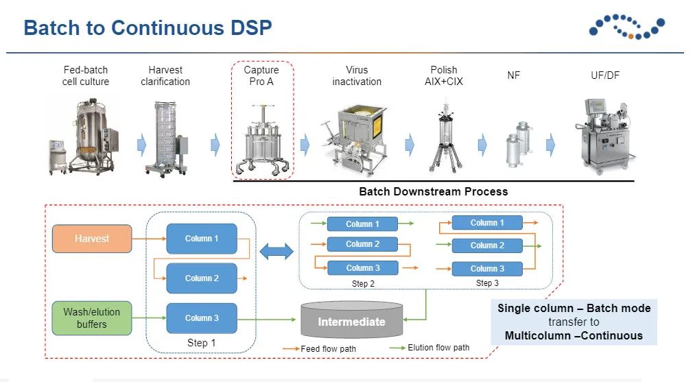 因應(yīng)細(xì)胞培養(yǎng)表達(dá)量大幅提升后而對下游純化所帶來的壓力, 漢騰生物以親和多柱層析的先進(jìn)技術(shù)來提高填料使用效率。由于單柱親和柱會有樣品流穿的問題, 因此填料的使用效率往往都只有40%以下, 而多柱聯(lián)用可把填料的使用效率提升至90%以上, 進(jìn)而顯著的降低填料使用量。與傳統(tǒng)的批次純化方式相比, 多柱連續(xù)層析技術(shù)可讓填料使用量減少高達(dá)80%。
