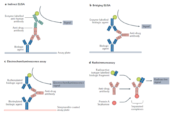 因于免疫原性會嚴(yán)重影響藥物的有效性和安全性,藥監(jiān)部門要求所有生物治療性藥物都要進(jìn)行免疫原性檢測,F(xiàn)DA對免疫原性的檢測給出的具體要求:高靈敏度、高特異性、高穩(wěn)定性及高親和力。ADA的檢測和確認(rèn)比較復(fù)雜,檢測結(jié)果會受到所使用的分析方法的影響。目前評估免疫原性的方法學(xué)包括不同類型的免疫分析平臺:如傳統(tǒng)酶聯(lián)免疫吸附分析(ELISA, 圖1a、b)、電化學(xué)發(fā)光免疫分析(ECL, 圖1c )和放射免疫分析(RIA, 圖1d),以及不同的ELISA檢測形式,如直接、間接、橋接和競爭ELISA等。