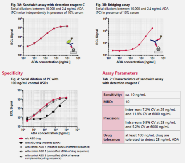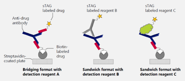 FyoniBio基于Meso Scale Discovery (MSD) 的電化學(xué)發(fā)光(ECL)平臺檢測臨床樣品中的ADA。并分別對橋式和雙抗夾心ELISA形式進(jìn)行檢測評估。在酸解預(yù)處理后,使用生物素化的ASO藥物作為捕獲試劑,然后將待檢樣本加到鏈霉親和素涂布的平板上,釕離子(sTAG)標(biāo)記的ASO藥物或檢測試劑A、B和C用于檢測(圖2)。