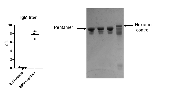 在細(xì)胞株構(gòu)建階段,漢騰生物研發(fā)團(tuán)隊選擇了具有最高穩(wěn)定性和特定生產(chǎn)力的CHO細(xì)胞系作為最終的先導(dǎo)克隆,并且通過調(diào)節(jié)載體比例改變產(chǎn)生的抗體滴度。漢騰生物IgMaxTM表達(dá)載體平臺最高可以達(dá)到8g/L的產(chǎn)量,并且IgM構(gòu)型均一,其中,五聚體比例接近100%,幾乎無六聚體產(chǎn)生(IgM有五聚體和六聚體形式,包含開放J鏈的五聚體形式是開發(fā)和生產(chǎn)IgM的目標(biāo)構(gòu)型)。