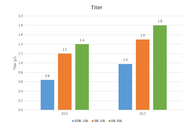 漢騰生物擁有國內(nèi)獨有的環(huán)軌搖晃式生物反應(yīng)器平臺,該平臺具有低剪切力,高氧傳質(zhì)效率,并具有良好的搖瓶至2500L規(guī)模放大一致性等優(yōu)點。同時由于特殊的培養(yǎng)方式,該平臺適合對剪切力敏感的蛋白生產(chǎn)(包括重組蛋白,雙抗等)。本案例中切換至10L環(huán)軌搖晃式反應(yīng)器(OrbShake SB10-X),相對傳統(tǒng)10L攪拌式反應(yīng)器(XDR-10L),表達量提升50%;另外,在OrbShake SB10-X放大至OrbShake SB50-X中,單位體積內(nèi)表達量也提高了20%。