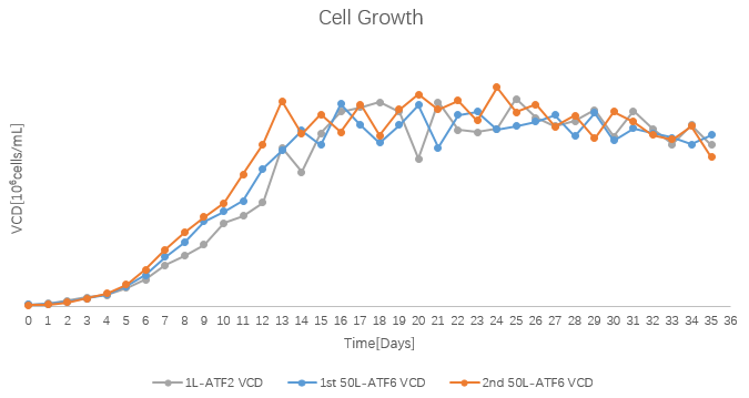 漢騰生物已建立了成熟的灌流工藝平臺,能夠?qū)崿F(xiàn)1L至200L規(guī)模的灌流工藝開發(fā)及生產(chǎn)。本案例中,通過對早期開發(fā)數(shù)據(jù)的分析,順利的在同規(guī)模(1L)實現(xiàn)工藝重復(fù)及確認,并成功放大至50L生產(chǎn)規(guī)模,成功幫助客戶完成了灌流工藝項目的引入及生產(chǎn)。