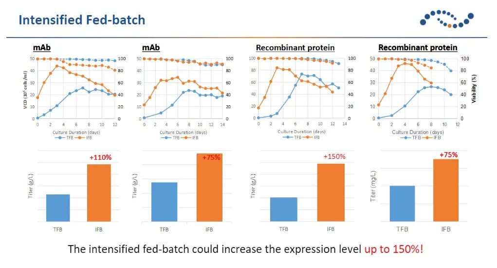 透過強(qiáng)化型的補(bǔ)料批培養(yǎng),并結(jié)合細(xì)胞生長特性, 生長代謝的監(jiān)控, 可以在與傳統(tǒng)的工藝方式相同的培養(yǎng)周期, 提高蛋白質(zhì)表達(dá)量超過70%。